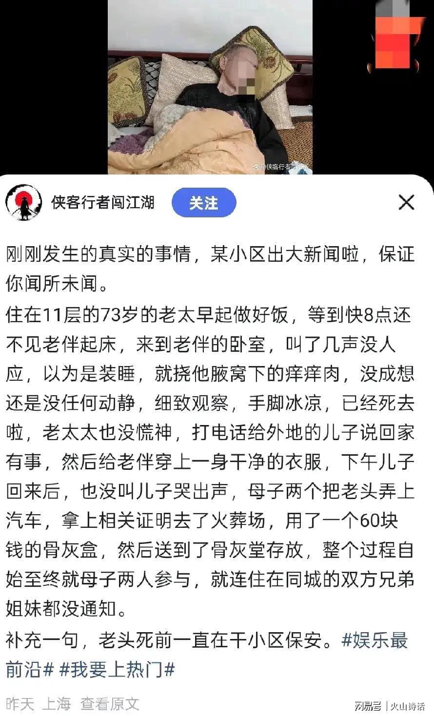 近日,一名上海老太太发现老头在睡梦中去世了,她通知儿子,然后母子俩把老头拉到火葬场火化了,花60元钱买的骨灰盒,寄存了。老太太处理完老头的后事只用一天,谁都没通知,连同城的亲人都没告诉。