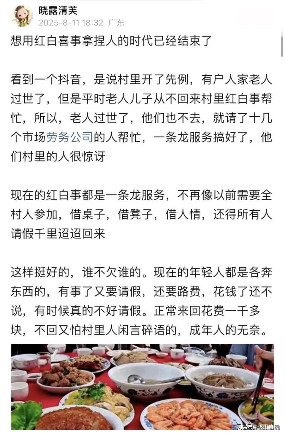 同样,就在不久前的8月11日,有广东网友发帖称,想用红白喜事拿捏人的时代已经结束了。
